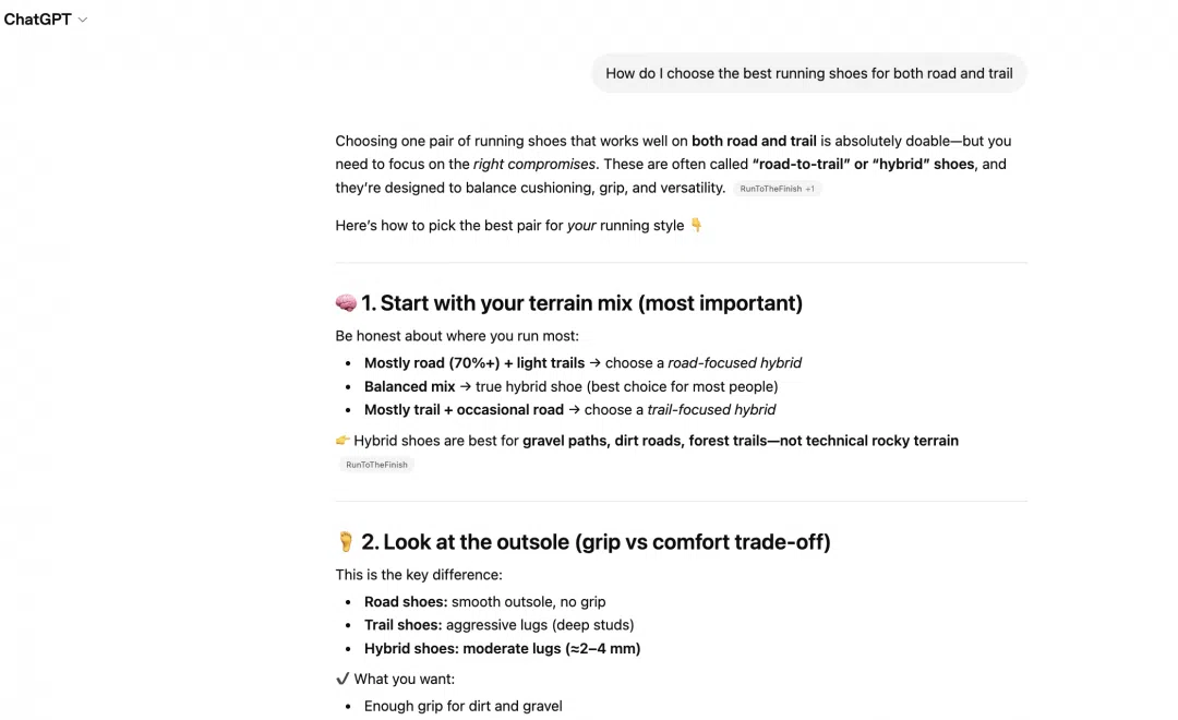 Some prompts generate purely factual responses where no brand is cited. Others are more specific, trigger a web search, and create a genuine opportunity for visibility. Those are the ones worth focusing on.