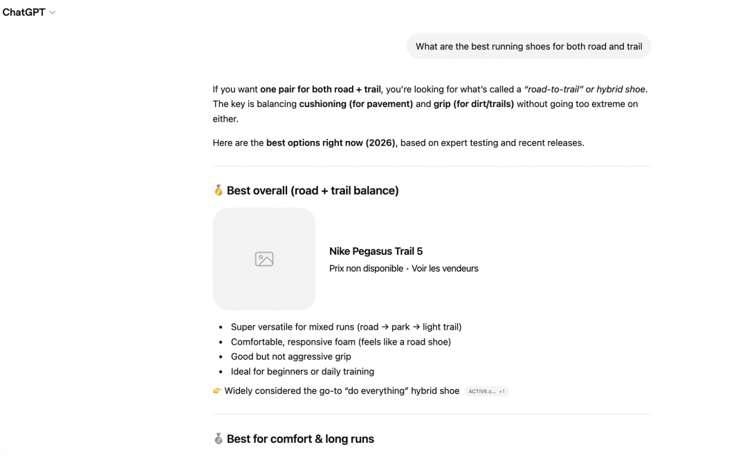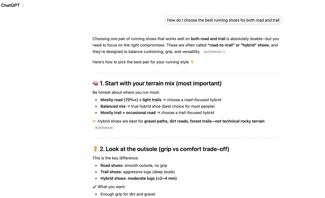 Some prompts generate purely factual responses where no brand is cited. Others are more specific, trigger a web search, and create a genuine opportunity for visibility. Those are the ones worth focusing on.